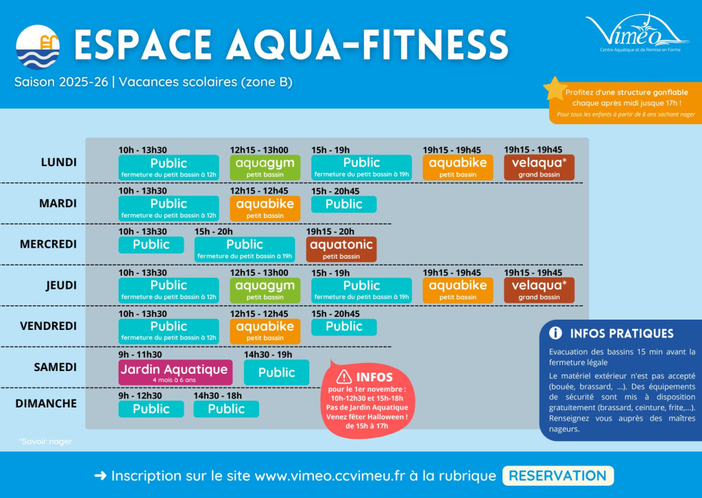 – Des séances d’aquafitness sont proposées sur réservation à partir du 6 octobre 2025 (hors carte d’abonnement) : Cliquez ici pour réserver https://vimeo.ccvimeu.fr/reservation-espace-aquatique/