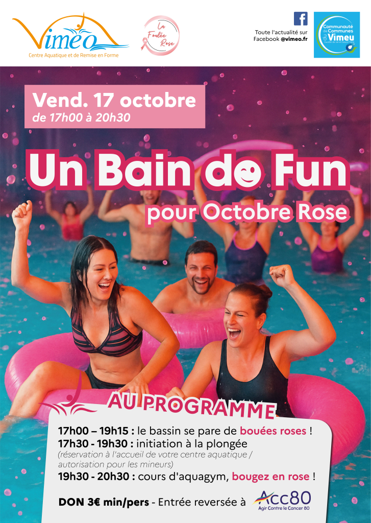 OCTOBRE ROSE Votre centre aquatique Viméo change de couleur en l’honneur d’Octobre Rose, le mois annuel de sensibilisation au dépistage du cancer du sein ! Vendredi 17 octobre, venez participer à « Un Bain de Fun pour Octobre Rose » au centre aquatique Viméo, de 17h à 20h30 !